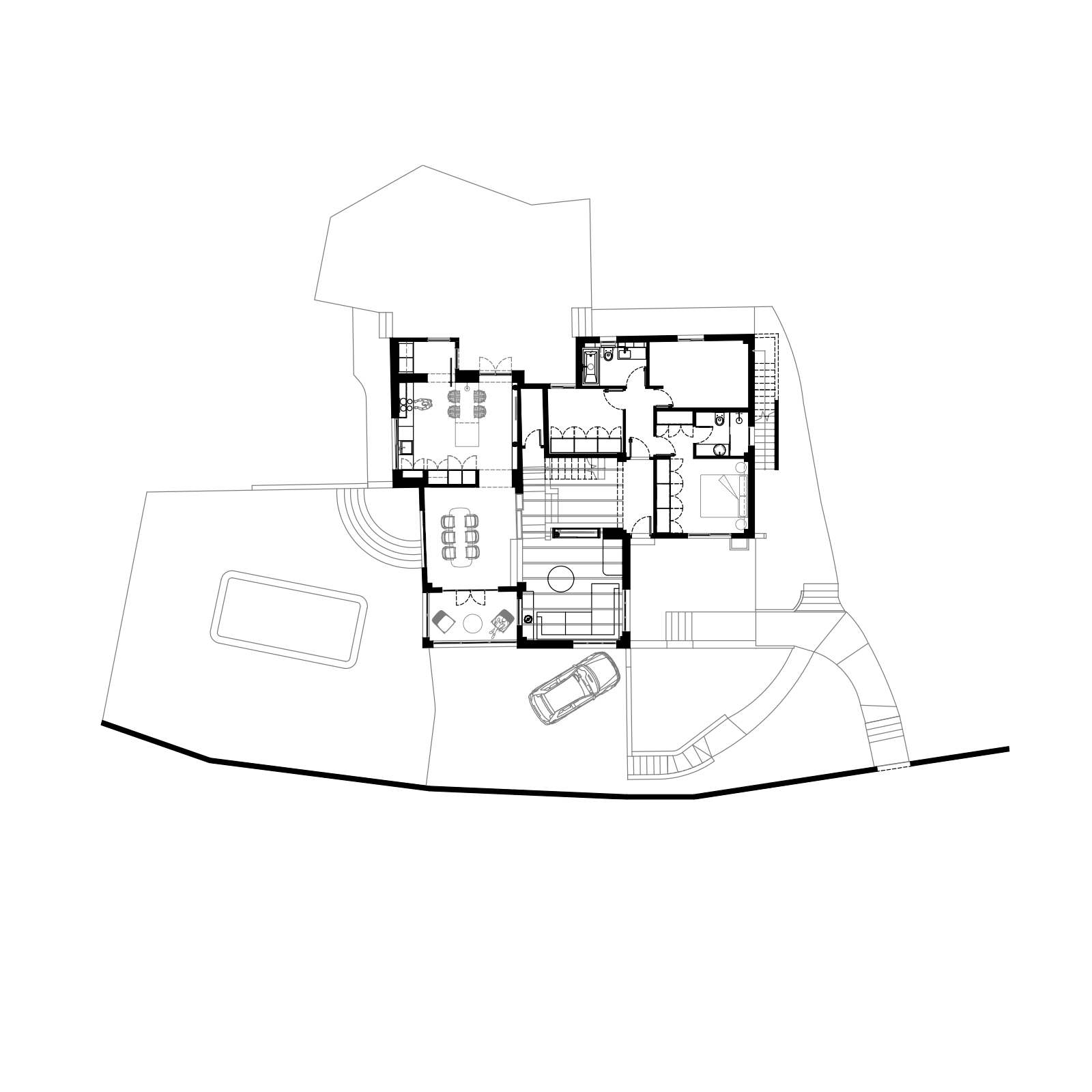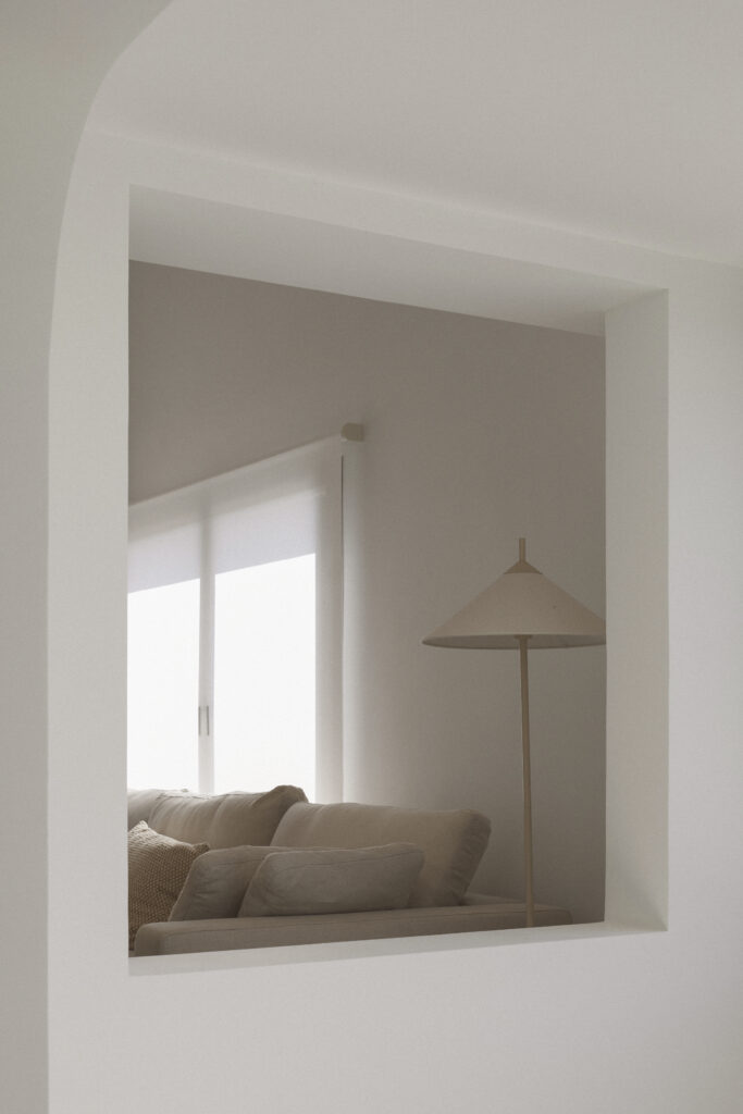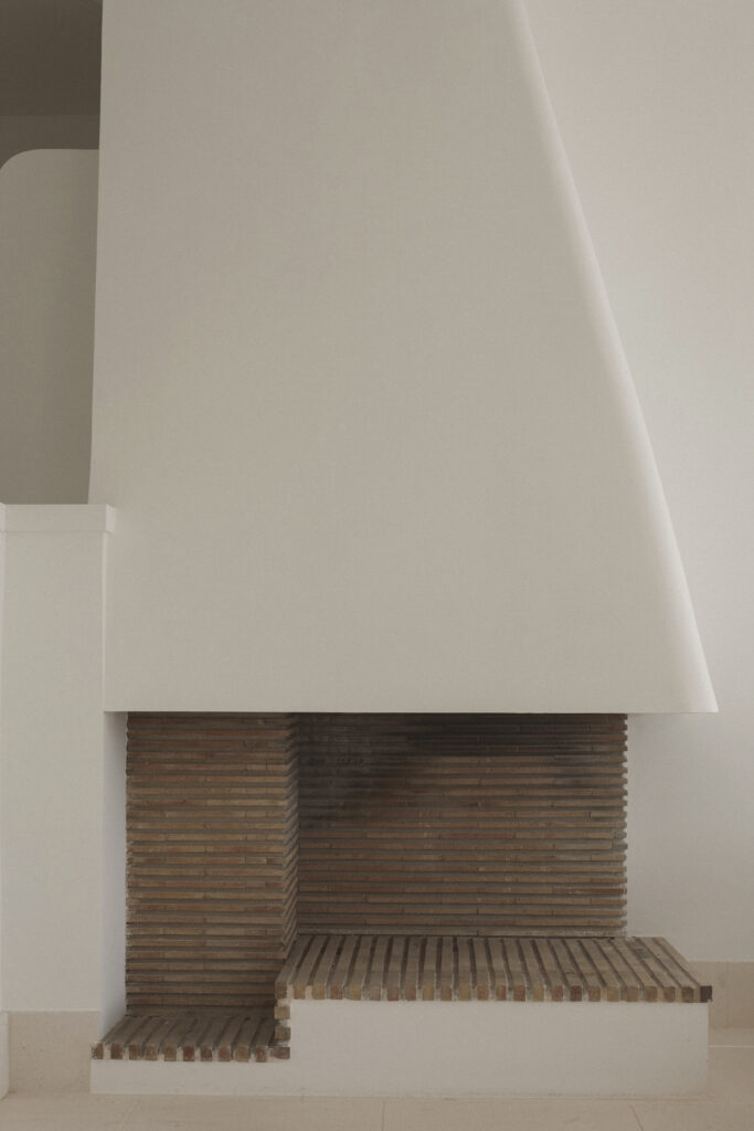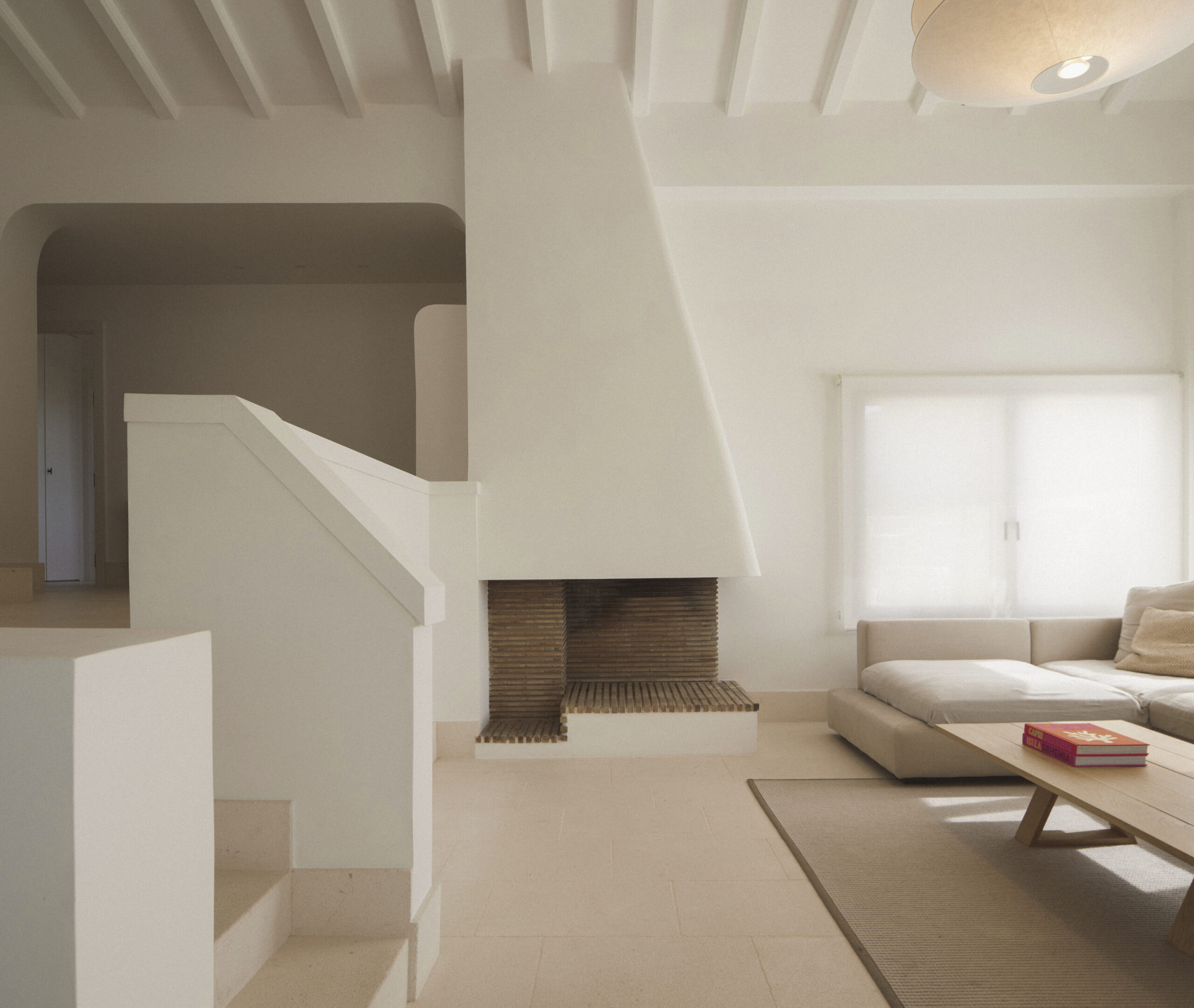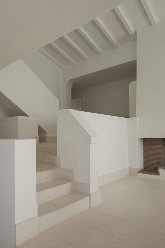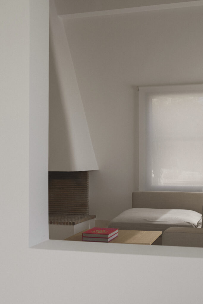El objetivo del estudio ha sido desarrollar una arquitectura donde la forma y la luz constituyan el verdadero sistema organizador del espacio doméstico. El proyecto se plantea como una operación geométrica sobre un volumen continuo: vaciar, plegar y espesar un único cuerpo construido hasta convertirlo en lugar habitable. A nivel formal, la vivienda se compone a partir de la tensión entre dos órdenes complementarios. Por un lado, la ortogonalidad estructural —suelo, techo y planos verticales— establece la estabilidad y la medida del espacio. Por otro, la aparición de aristas redondeadas y encuentros suavizados disuelve la rigidez de esa retícula y transforma la geometría en algo próximo al modelado. Las piezas no se añaden, emergen por continuidad material. La escalera, el paso curvo y la campana de la chimenea son deformaciones controladas de una misma masa blanca, operaciones de sustracción y transición más que elementos autónomos. La chimenea se concibe como un volumen primario que organiza la percepción mediante proporción y verticalidad. Su geometría troncopiramidal introduce una dirección ascendente que equilibra la horizontalidad dominante del espacio. No actúa como objeto focal en sentido decorativo, sino como referencia dimensional: un elemento que permite leer la escala del interior y medir las distancias. Su base baja prolonga el plano del suelo, mientras su altura establece un eje de gravedad visual que ordena la estancia sin dividirla. La continuidad geométrica se refuerza mediante la reducción material. El acabado homogéneo elimina la lectura fragmentada de planos independientes y permite percibir el interior como un solo cuerpo tallado. Así, la arquitectura no se entiende como ensamblaje sino como topografía interior, donde los cambios de dirección, espesor o curvatura sustituyen a los límites convencionales. La luz natural completa esta construcción formal. En lugar de penetrar de manera directa, se filtray se difunde sobre las superficies blancas, transformándolas en planos reflectantes que amplifican la profundidad. La iluminación no subraya objetos sino geometrías. Las sombras son graduales, nunca abruptas, permitiendo que la percepción del espacio dependa del tiempo y no de la decoración. En líneas generales el proyecto busca así una arquitectura estable y atemporal donde la forma se define por proporción y continuidad, y donde la luz actúa como materia variable capaz de activar el volumen. El espacio no pretende ser contemplado como imagen, sino experimentado como secuencia: una habitación cuya identidad surge de la relación entre geometría precisa y luminosidad calmada.