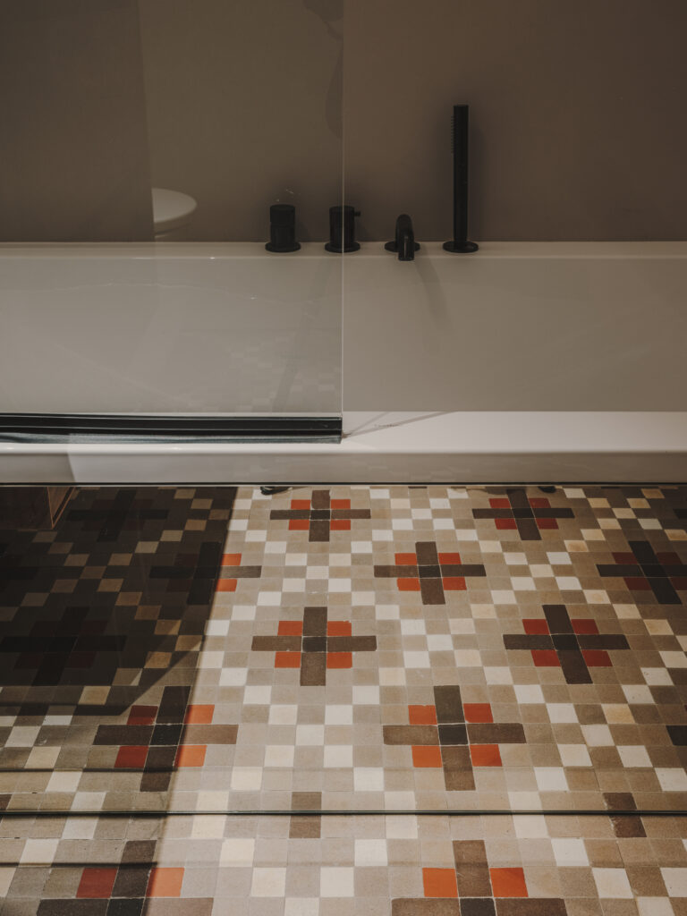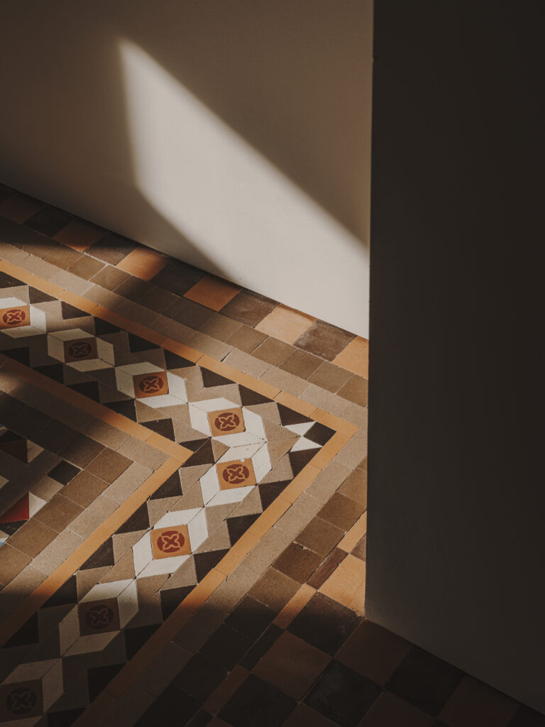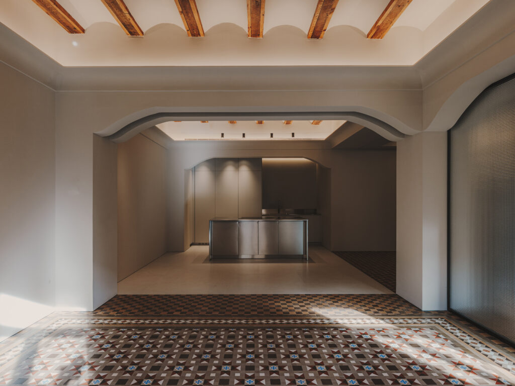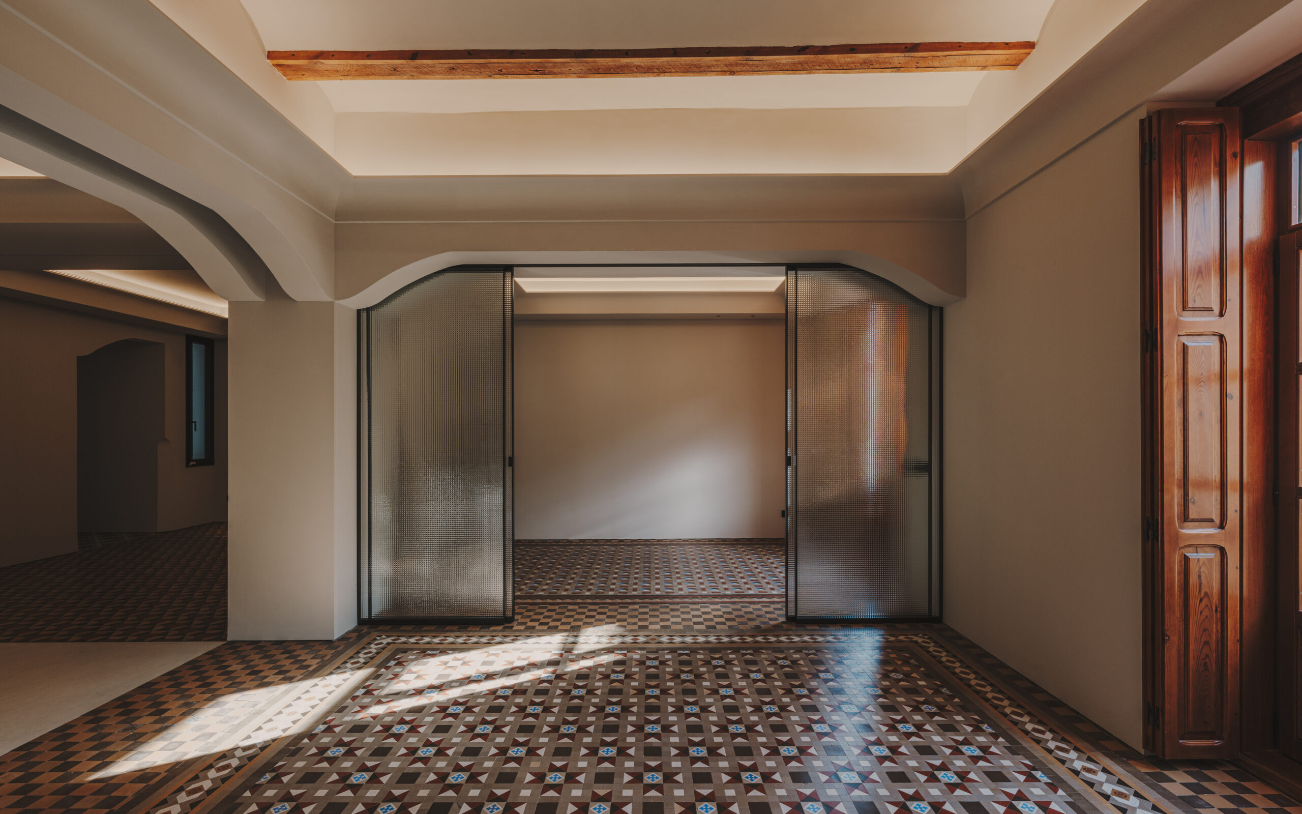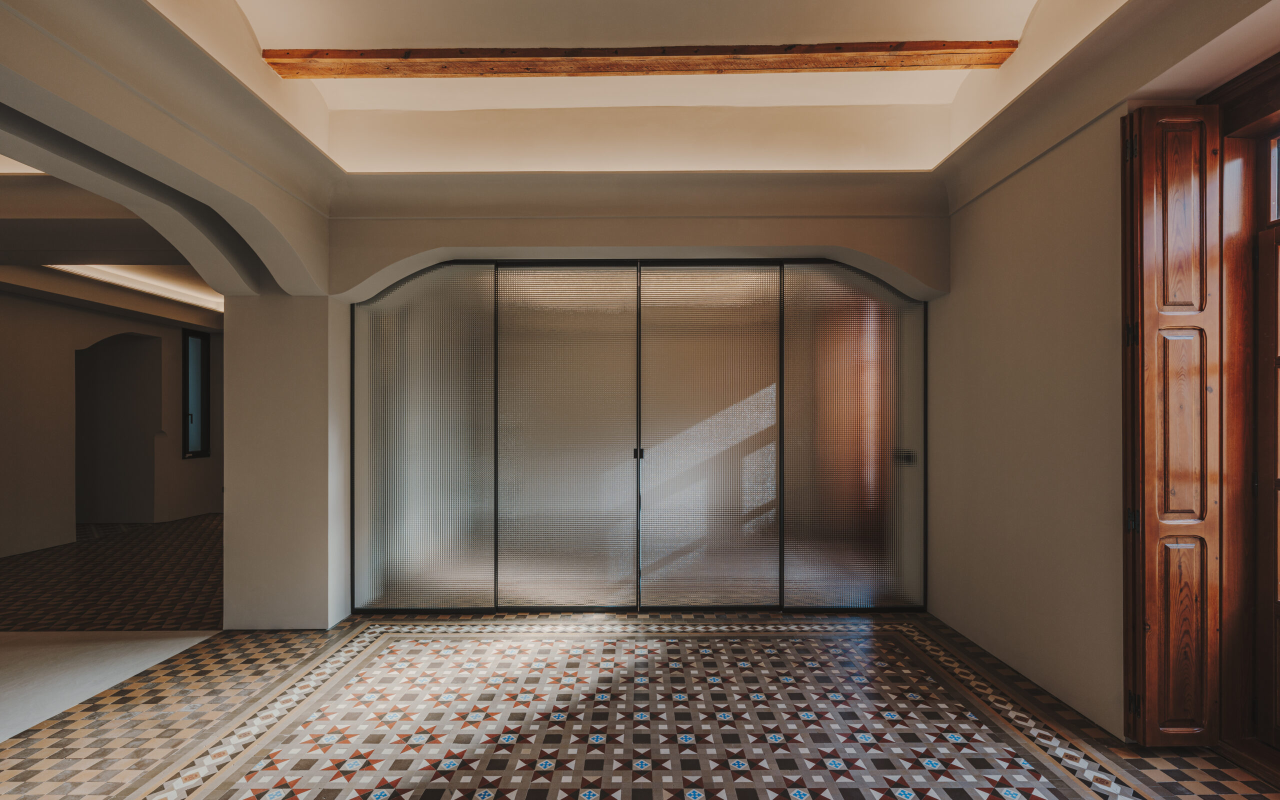 El proyecto se desarrolla en un edificio del centro histórico con elementos estructurales y decorativos de alto valor patrimonial, cuya conservación condiciona la intervención. Se prioriza la preservación y puesta en valor de los elementos originales, integrándolos en una propuesta funcional y contemporánea. El elemento central es el pavimento de mosaico de Nolla, un revestimiento hidráulico fabricado históricamente en esta ciudad, caracterizado por su resistencia, composición cerámica y diseños geométricos de tradición modernista. Se procede a su restauración y consolidación, asegurando la compatibilidad de nuevos materiales y morteros con los existentes, garantizando durabilidad y estabilidad dimensional. Las nuevas geometrías se diseñan con precisión, incorporando reminiscencias clásicas estilizadas, que se ejecutan en materiales compatibles y técnicas constructivas contemporáneas sin restar protagonismo al pavimento histórico. La intervención deja a la vista el sistema tradicional de construcción: estructura de madera de cubierta y forjados de bovedilla cerámica. Estos elementos se refuerzan estructuralmente donde es necesario, con intervención mínima, preservando su integridad y carácter original. Se presta especial atención a la iluminación y percepción de la materialidad, utilizando estrategias que resaltan la textura de la madera y la bovedilla, así como la continuidad y geometría del mosaico. La propuesta establece un equilibrio entre conservación, legibilidad histórica y soluciones constructivas actuales, asegurando tanto la estabilidad estructural como la coherencia estética del conjunto.