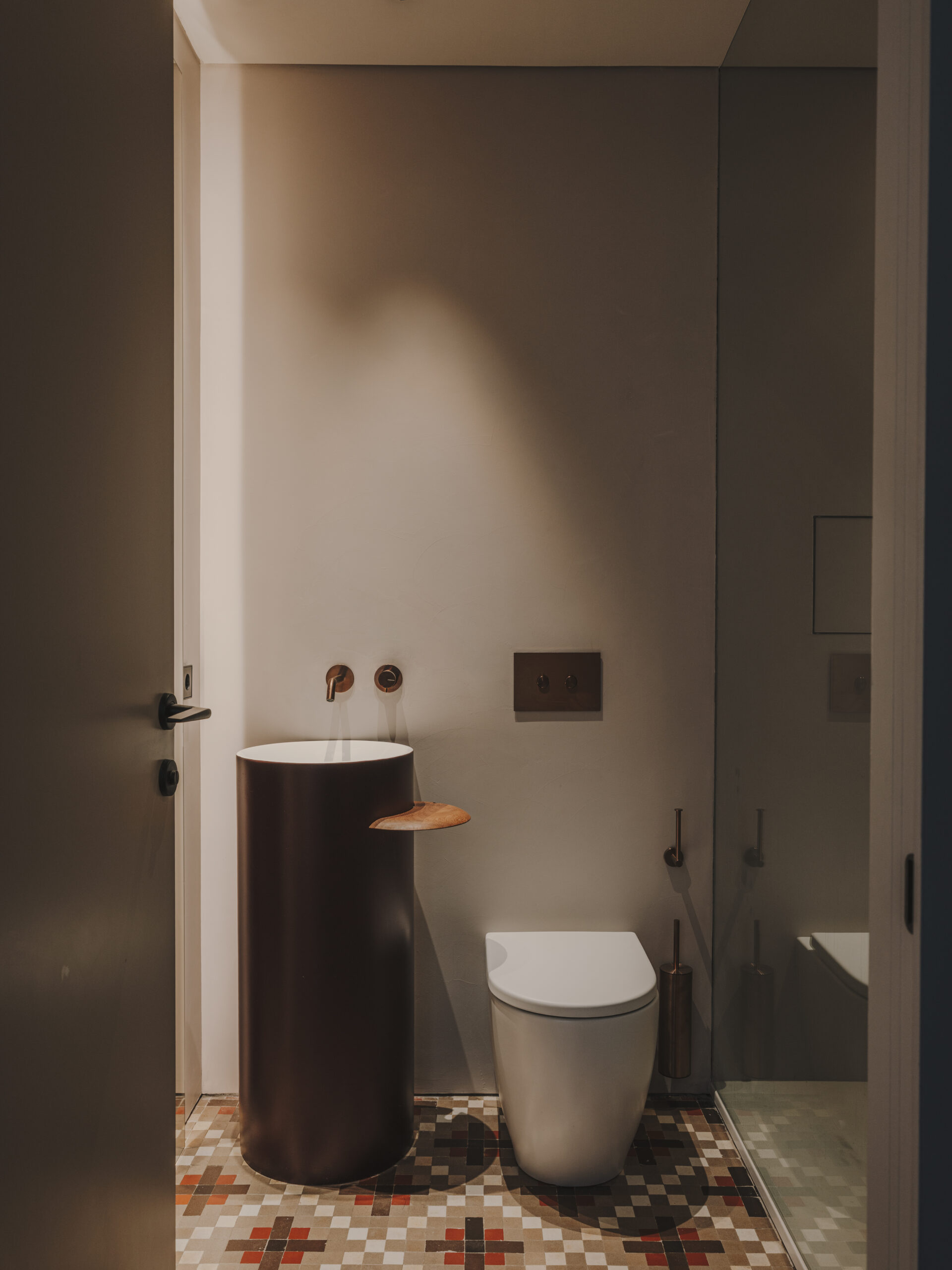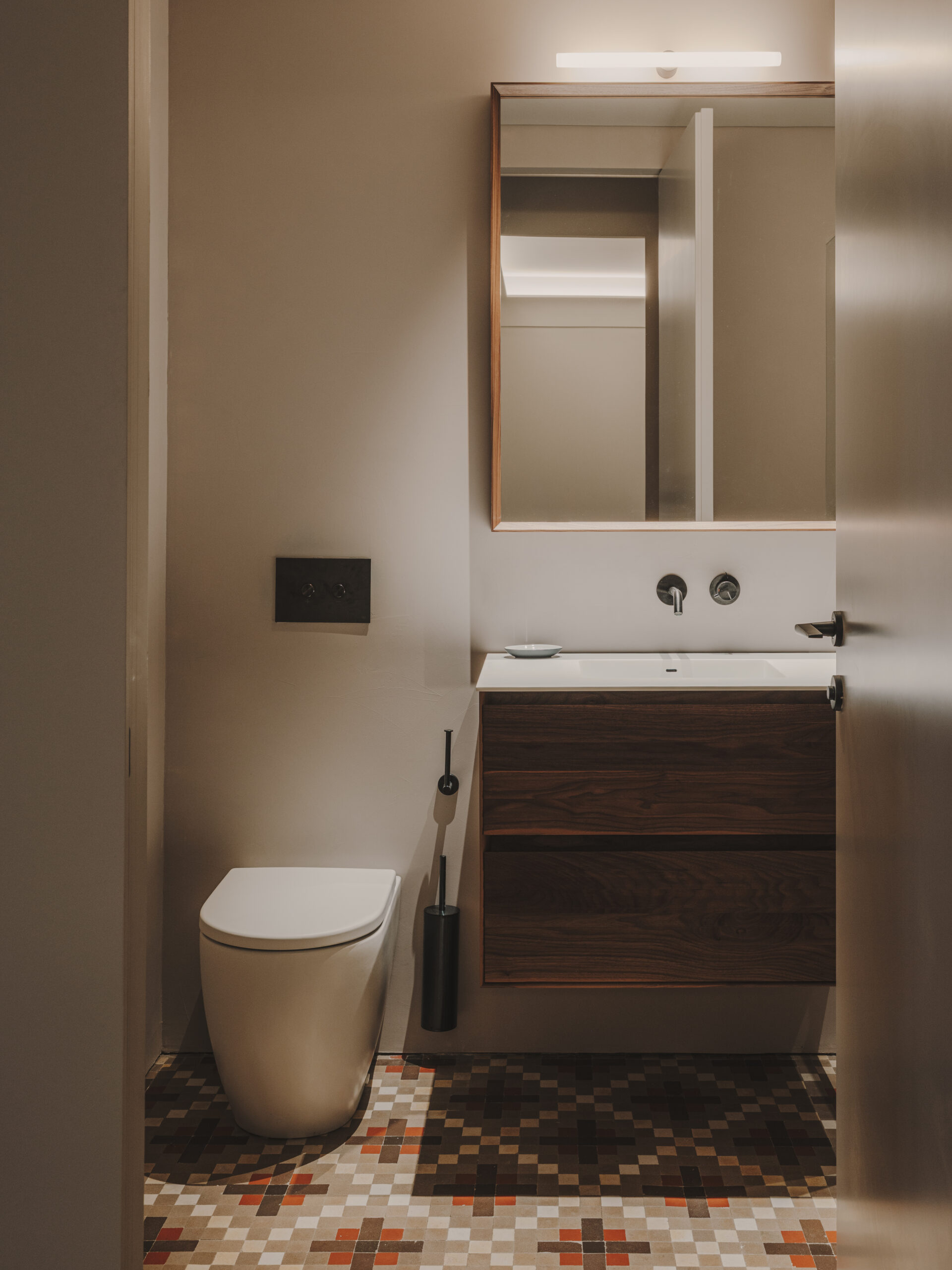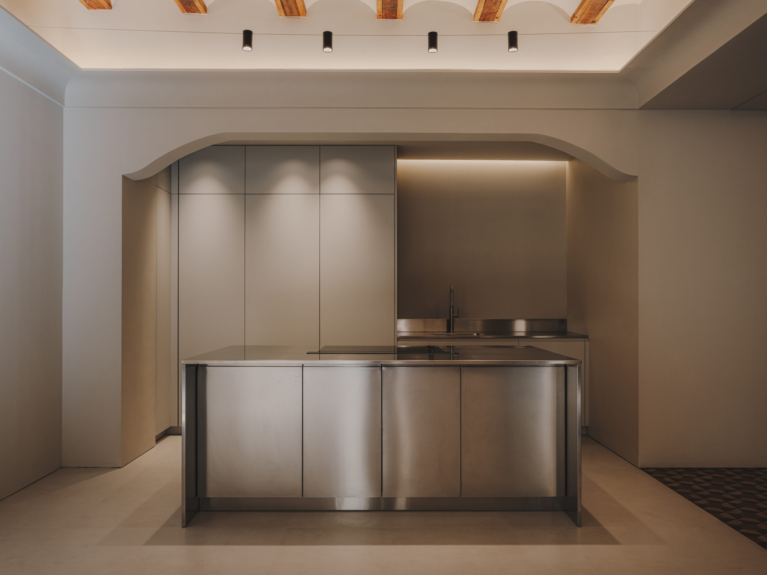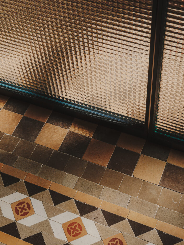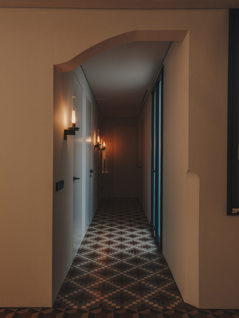 El proyecto se desarrolla en un edificio del centro histórico con elementos estructurales y decorativos de alto valor patrimonial, cuya conservación condiciona la intervención. Se prioriza la preservación y puesta en valor de los elementos originales, integrándolos en una propuesta funcional y contemporánea. El elemento central es el pavimento de mosaico de Nolla, un revestimiento hidráulico fabricado históricamente en esta ciudad, caracterizado por su resistencia, composición cerámica y diseños geométricos de tradición modernista. Se procede a su restauración y consolidación, asegurando la compatibilidad de nuevos materiales y morteros con los existentes, garantizando durabilidad y estabilidad dimensional. Las nuevas geometrías se diseñan con precisión, incorporando reminiscencias clásicas estilizadas, que se ejecutan en materiales compatibles y técnicas constructivas contemporáneas sin restar protagonismo al pavimento histórico. La intervención deja a la vista el sistema tradicional de construcción: estructura de madera de cubierta y forjados de bovedilla cerámica. Estos elementos se refuerzan estructuralmente donde es necesario, con intervención mínima, preservando su integridad y carácter original. Se presta especial atención a la iluminación y percepción de la materialidad, utilizando estrategias que resaltan la textura de la madera y la bovedilla, así como la continuidad y geometría del mosaico. La propuesta establece un equilibrio entre conservación, legibilidad histórica y soluciones constructivas actuales, asegurando tanto la estabilidad estructural como la coherencia estética del conjunto.